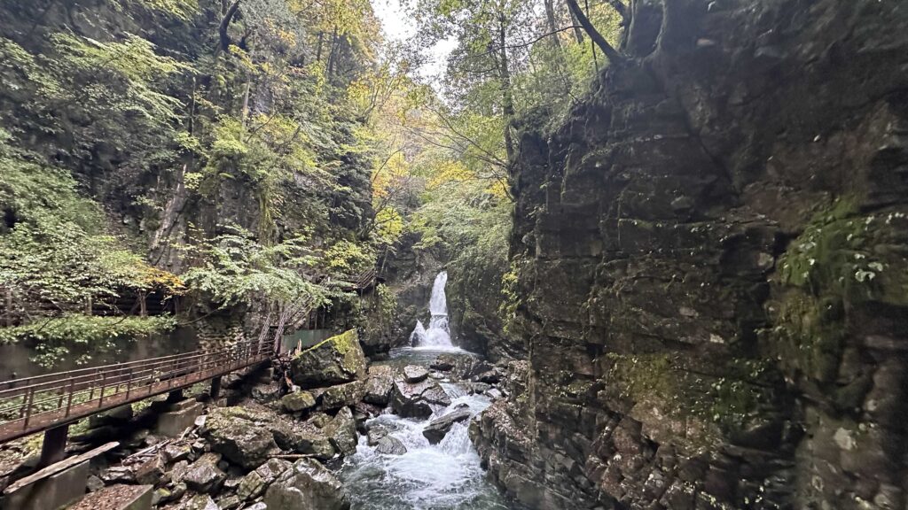 While the parking lot area of Gandate is very vibrant yellows and reds, the waterfall hiking route is still very green, with very slight yellow coloration.