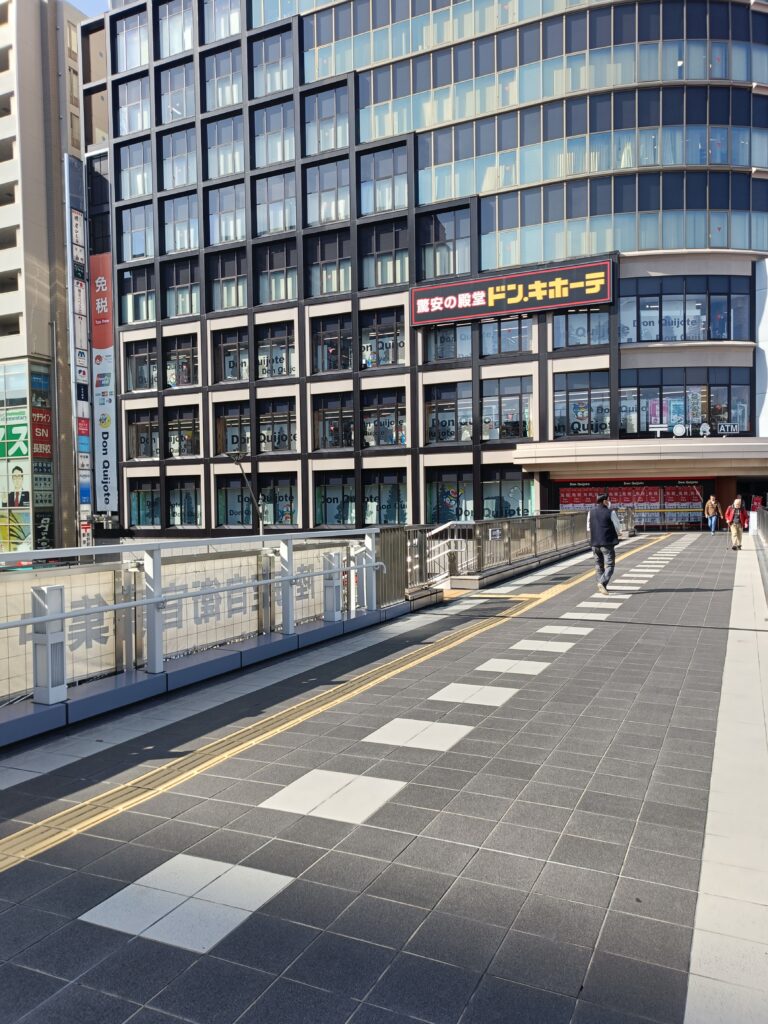 写真のドン・キホーテのビルの手前に左に降りる階段があります。